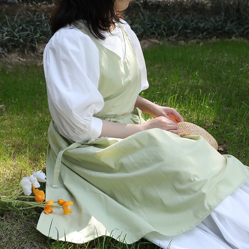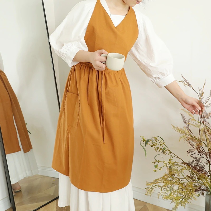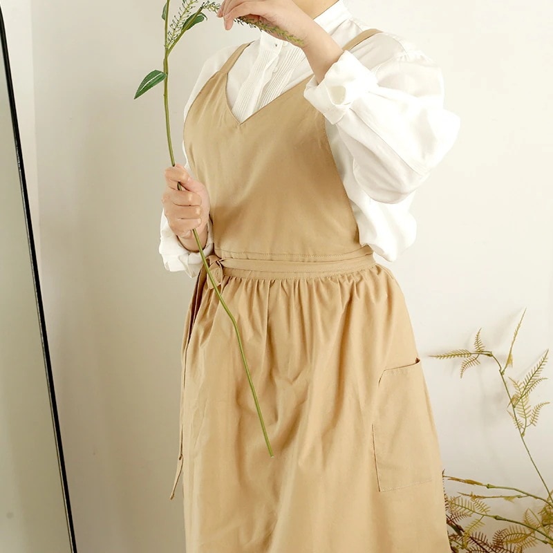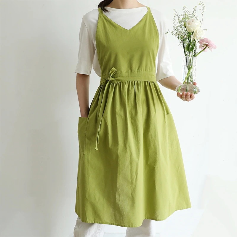 エプロン 夏用薄手 日本・韓国風Vネックノースリーブ 撥水加工 単色 大人用コットンエプロン