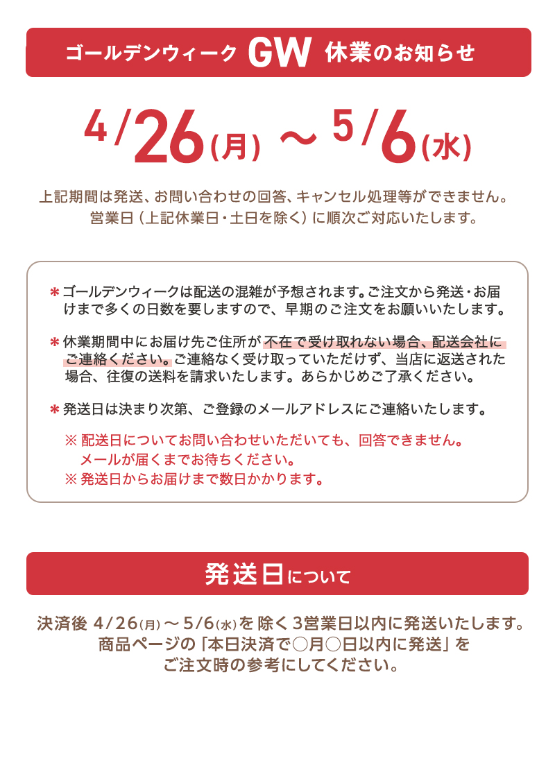 ■発送目安は商品ページにある、配送情報「本日決済で◯月◯日以内に発送」をご注文時の参考にしてください。