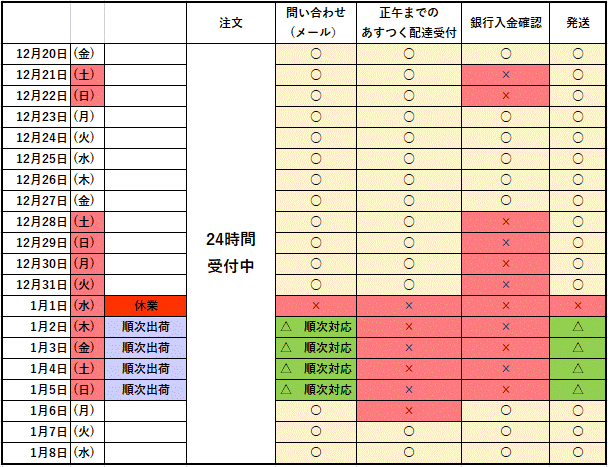 年末年始営業日程のお知らせ(注文受付無休)