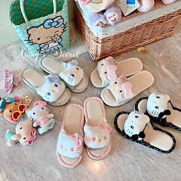 daily deal【即納】日系可愛い リネン キティ 布製クールサンダル 家居用 通気性 吸汗 滑り止め クッション感 ワンストラップサンダル