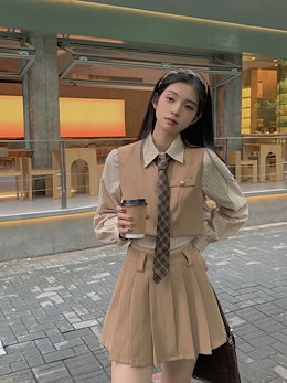 time saleスーツセットアップスーツセットレトロなカレッジ風シャツ+ベスト+プリーツスカートのスリムショート丈4点セット