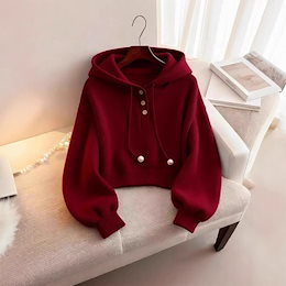 time sale赤カーディガン付きフードニットセーターデザイン感女性秋冬ルーズラフ風厚手保温トップス
