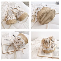 かごバッグ インナー巾着バッグ付き ショルダーバッグ レディース 総レース おしゃれ ナチュラル 2way 斜め掛け 手提げ バケットバッグ 軽量 小さめ レディース リゾート 旅行 草編みバッグ ハ