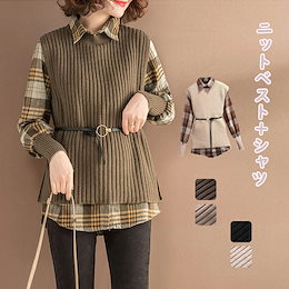 トップス シャツ レディース 2点セット ブラウス ニットベスト 長袖 秋 ニット ベスト 冬 セーター ニットセーター 無地 チェック チェック柄 ノースリーブ ゆったり 二点セット 春 秋物 カジ