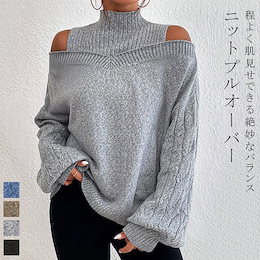 肩スリット レイヤード風 ニット ハイネック トップス レディース 秋 冬 オフショルダー ニットトップス 長袖ニット セーター プルオーバー 大きいサイズ ストレッチ プチハイネック ゆったり ボリ