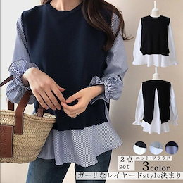ニット切り替えシャツブラウスレディースVネックシャツダブルブレストトップス透け感長袖スキッパーブラウス韓国風