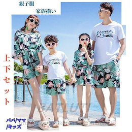 【大人ページ】親子コーデ夏服親子服家族揃いペアルックビーチ2点セット上下セットTシャツショートパンツ総柄葉柄親子海旅行リゾートレディースキッズメンズ半袖パンツカップル親子ペアセッ大工場製造