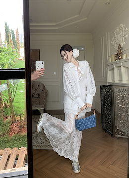 激安セール 透け感レースフリル拼接 ロングシルエットワンピース 長袖×ハイウエスト 大人の上品コーデ