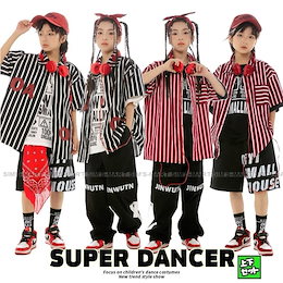 ヒップホップ 衣装 キッズダンス衣装 セットアップ 子供ダンス服 派手 黒 赤 ストライプ K-POP 韓国 hiphop 男の子 ガールズ ダンス衣装 キッズ シャツ パンツ