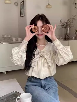 レディース ブラウス トップス シャツ 前開き 長袖 パフスリーブ Vネック 襟付き セーラーカラー プリーツ フリル リボン かわいい 大人可愛い シンプル カジュアル 上品 おしゃれ こなれ感