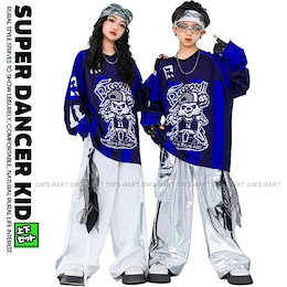 新しいダンスウェア ヒップホップ 衣装 セットアップ 派手 青 白 銀 メタリック ダンス衣装 キッズ 子供ダンス服 ダンスウェア K-POP 韓国 男の子 ガールズ ロンT パンツ2つの方がお得です