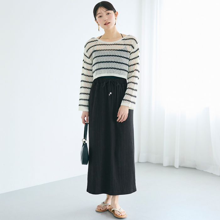 ウェスト部分がボワッと広がっておりコーディネートによっては少し太って見える。でも爽やかで可愛い。