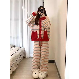 レイジースタイルのストライプ柄ハーフフリースニットパジャマ冬用の厚手のプラッシュホームウェアセット
