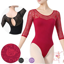 バレエ レオタード 大人 レディース 綿混 半袖 レース 丸首 Vネック 背中開き オープンバック ストレッチ レッスン ダンス エレガント 上品 コットン va-014